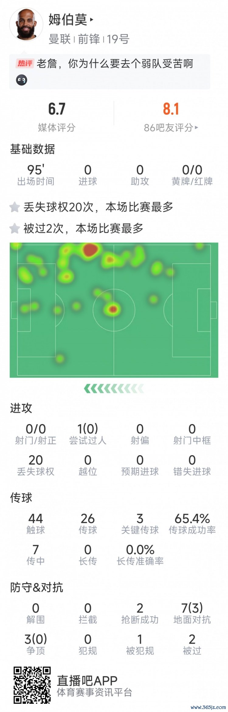 战旧主留情?姆伯莫本场数据:0射球 、0成功过人,3次关键传送球