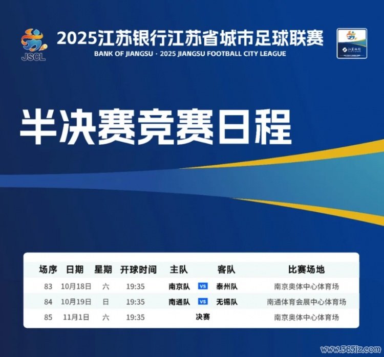 苏超准总决赛 日程:10月18日南京队vs泰州队,19日南通队vs无锡队