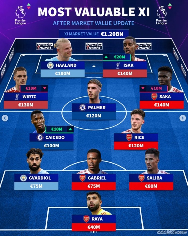 英超身价最贵阵:哈兰德、维尔茨、伊萨克在列,总身价12亿欧