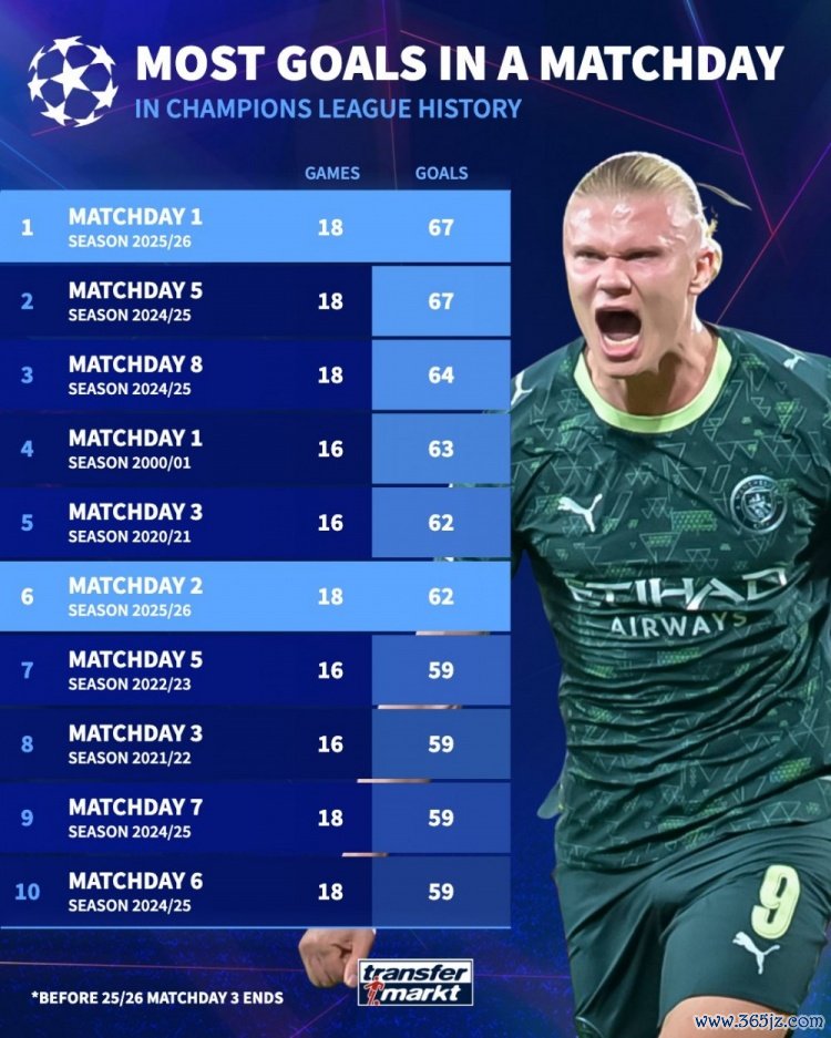 欧冠赛事 日得分 榜:本赛季首轮、上赛季第五轮67球并列居首