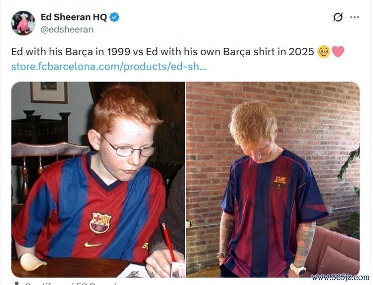10月24日讯 英国创作歌手艾德-希兰更新社媒,晒出自己在1999年和2025年身穿巴萨运动活动 服 的照片。