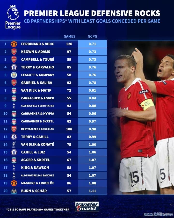 英超中卫搭档场均最少丢球榜:费迪南德维迪奇第一,红军多组上榜