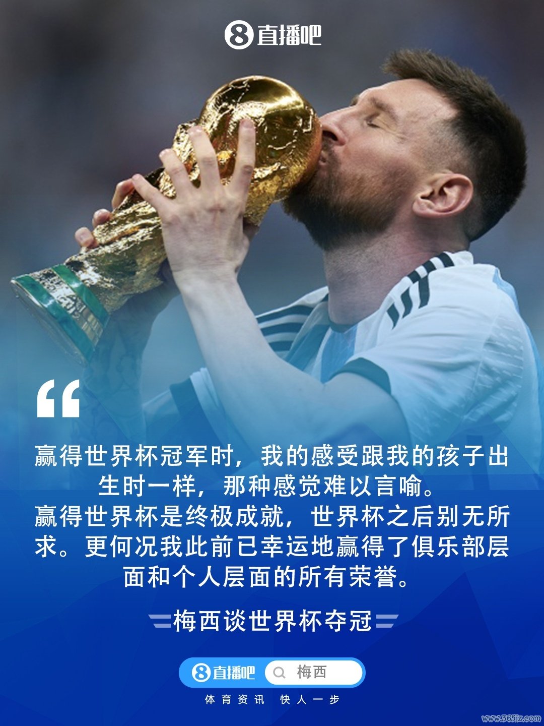 梅西:“虽然两者毫无关联,但当我作为职业球员赢得世界杯赛 第一名 时,我的感受跟我的孩子出生时一样。那种感觉难以言喻,如此特别、如此伟大,任何言语都显得苍白。”