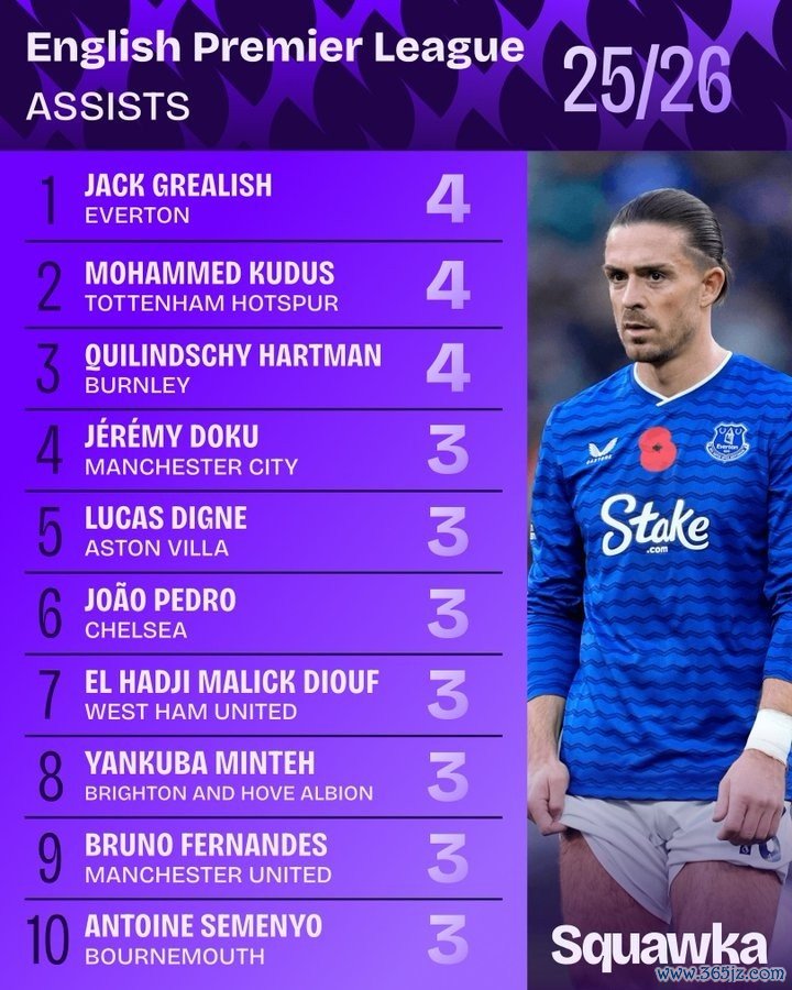 11月11日讯 英超职业联赛 已经进行了11轮,squakwa也统计了本赛季英超助功 情况,五大联赛格拉利什等3人并列居首。