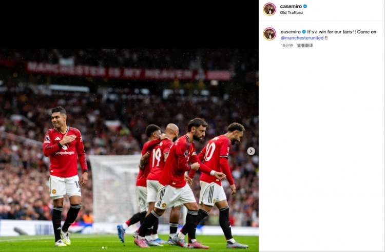 赛后, 中超卡塞米罗更新社媒:这是献给我们球迷的获胜 !助威 !