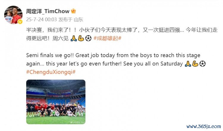 周定洋在个人微博中写道:准总决赛 , 中超我们来了!!小伙子们今天表现太棒了, 网球新闻足球直播吧又一次挺进四强… 今年让我们走得更远吧!周六见 🙏💪⚽️