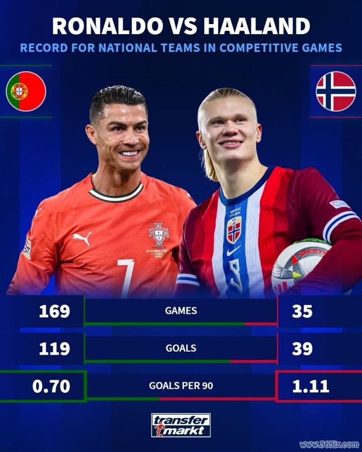 09月10日讯 德转官方对比了C罗与哈兰德各自国家队生涯的数据,布莱顿在线直播并发问:哈兰德能在未来某天追上C罗的记录 吗?