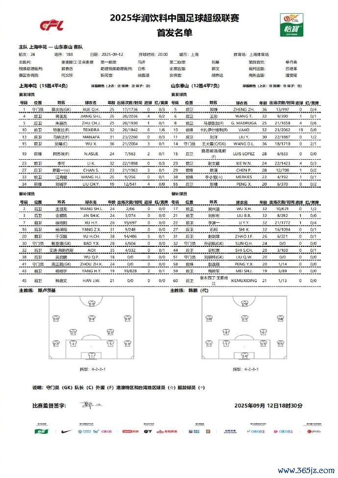 2025华润饮料中超职业联赛 第24轮 上海申花vs山东泰山杆位名单