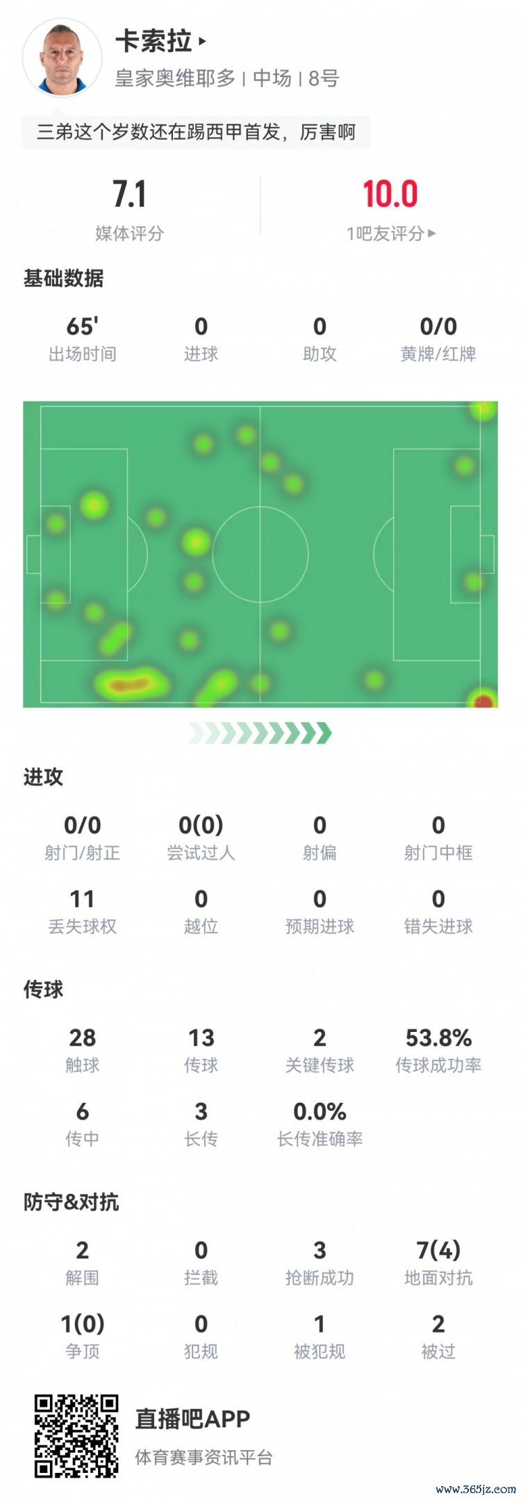 9月26日讯 正在进行的西甲,皇家奥维耶多主场作战 1-2巴萨。此役40岁的卡索拉杆位65分钟被换下, 中超高清直播球员全场重积分 据如下↓