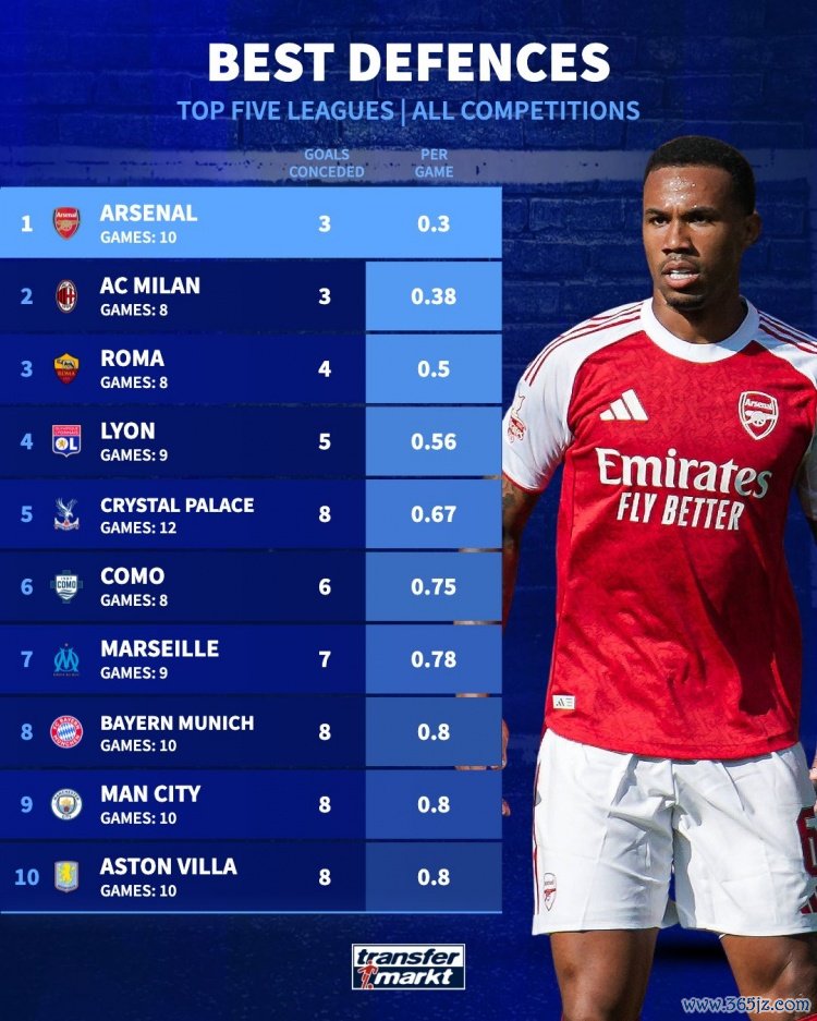 本赛季五大职业联赛 球队场均失球最少排名(所有赛事):